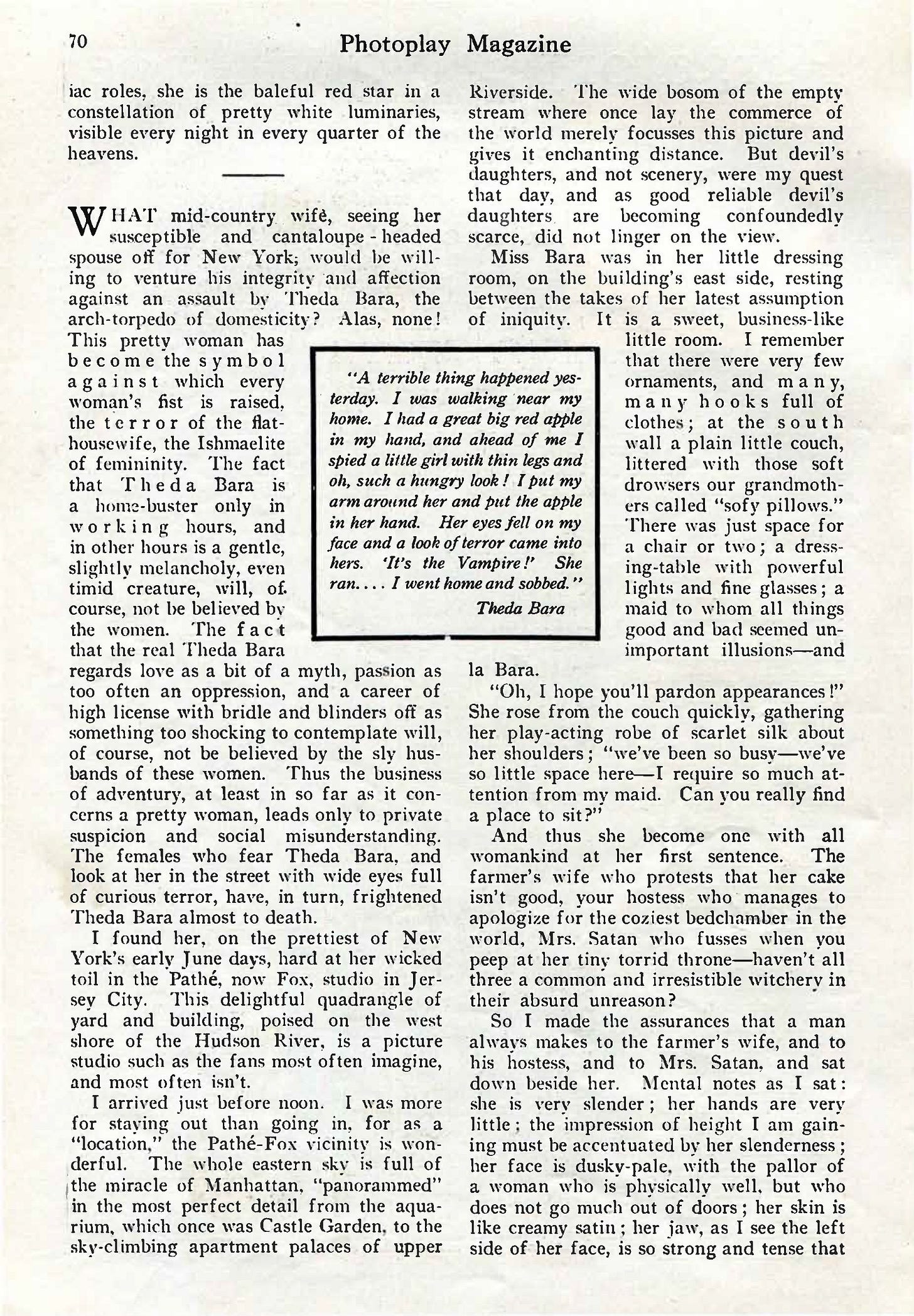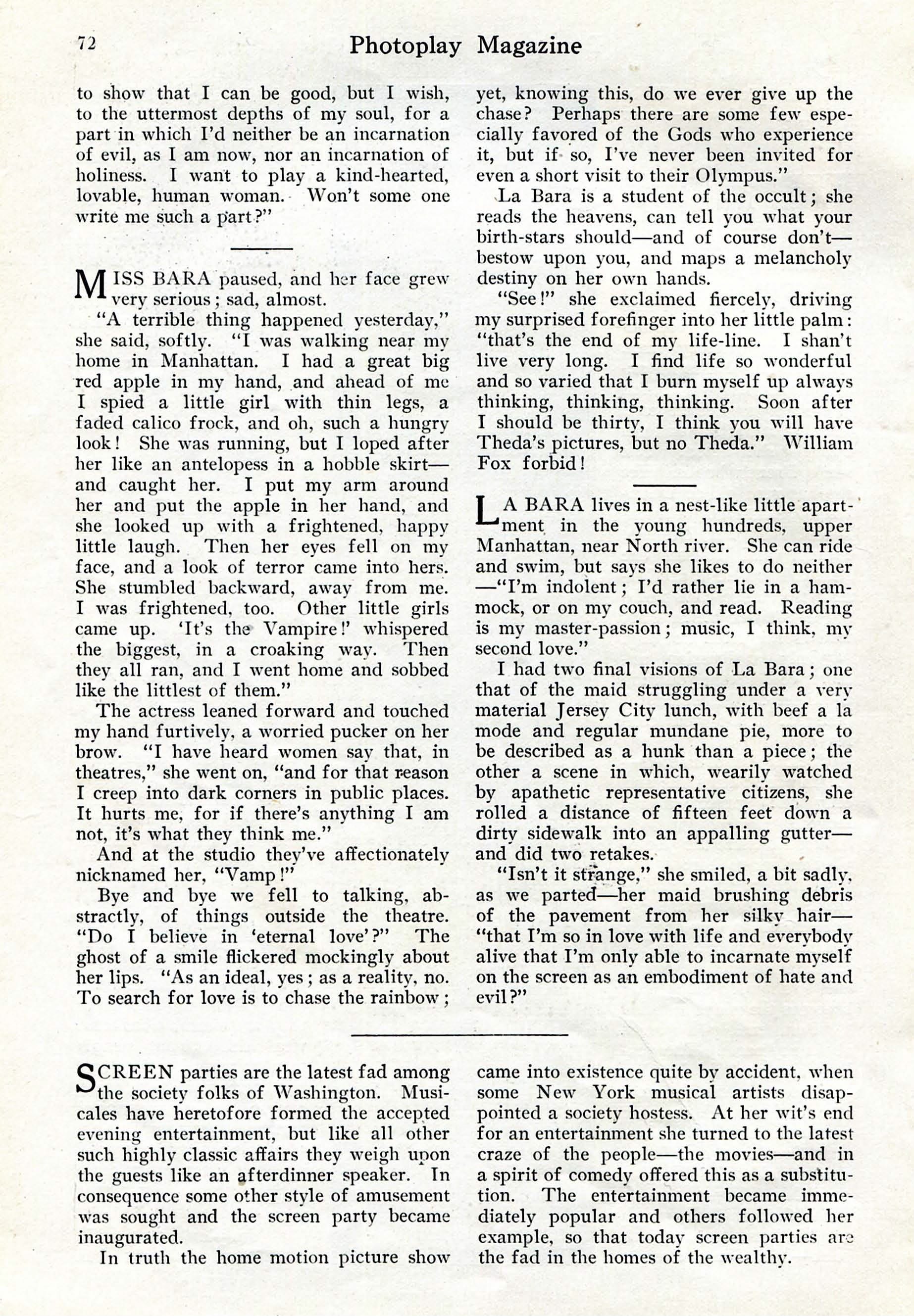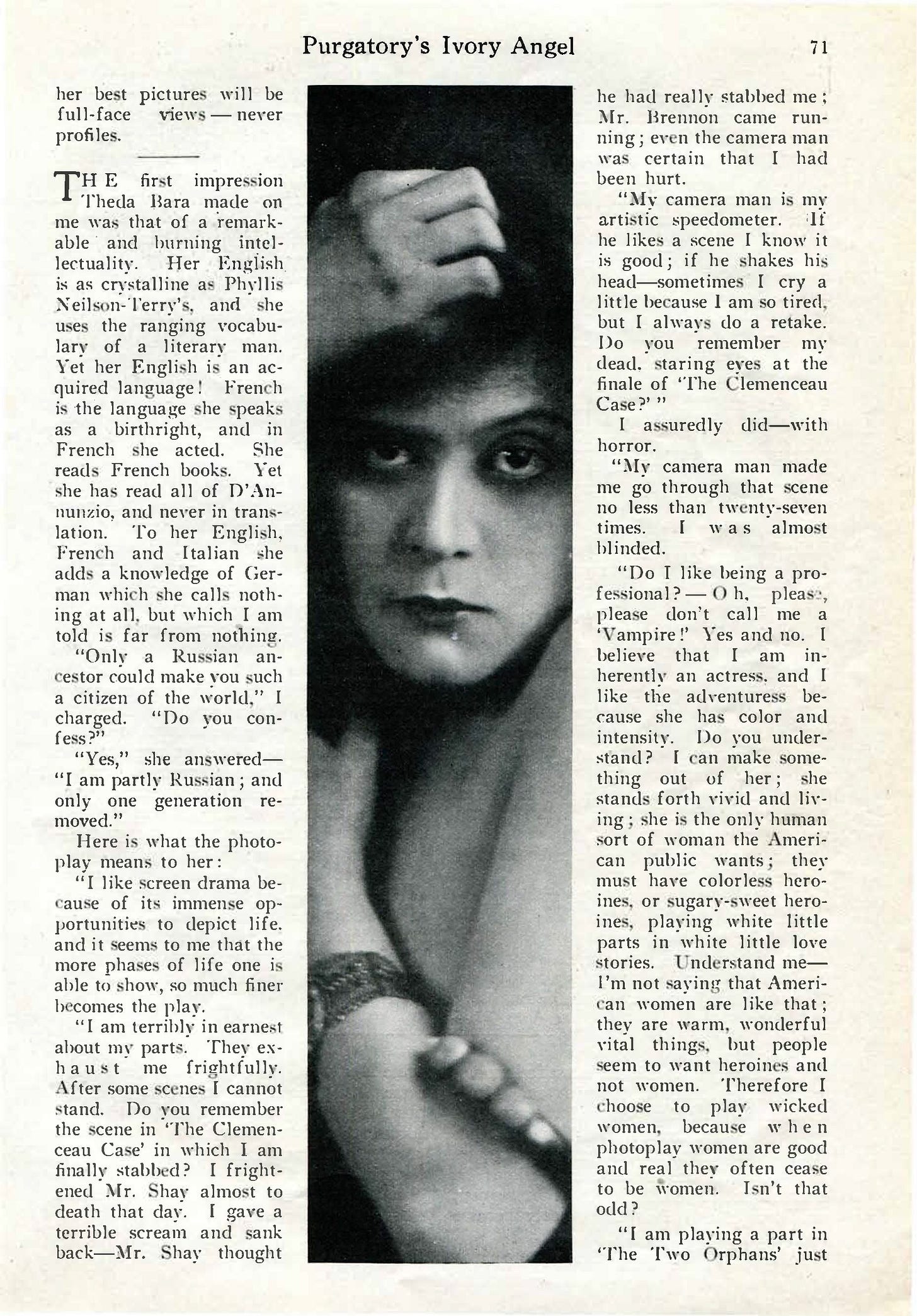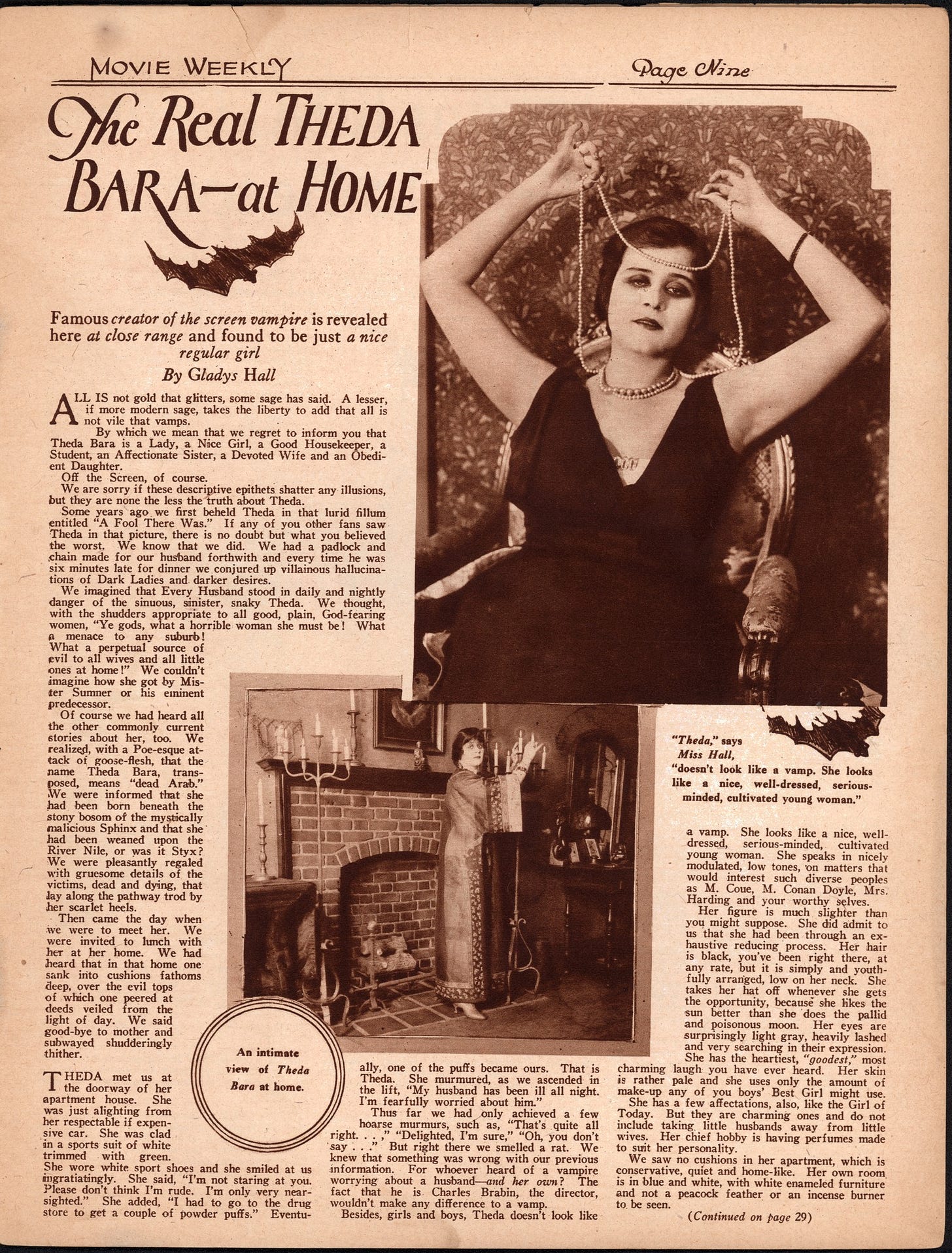 “Scientists have questioned this most extraordinary of women to secure fresh evidence to support their half-proved laws of transmigration of souls, but the result has only been to prove that, though Miss Bara is the greatest delineator of evil types on the stage or screen today, she is in real life a sweet wholesome woman who detests the abnormal.”