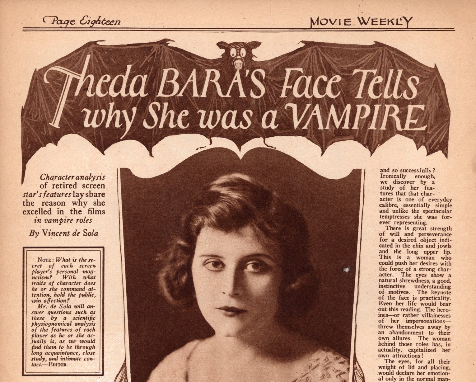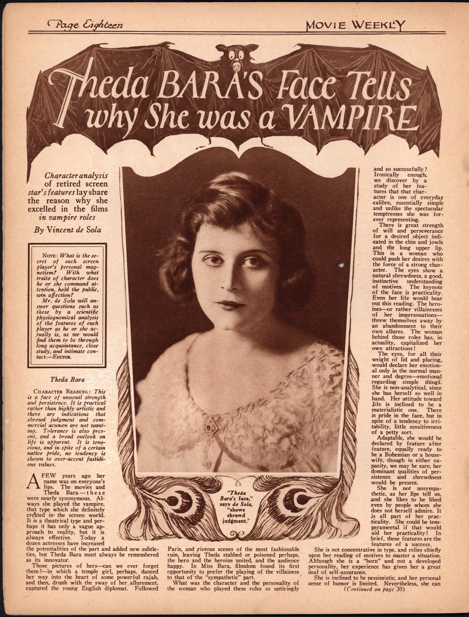 I write this with a photograph of Theda Bara, the William Fox “Vampire,” before me. Never in all my experience as a professional character reader have I gazed into a face portraying such wickedness and evil—characteristics of the vampire and the sorceress.