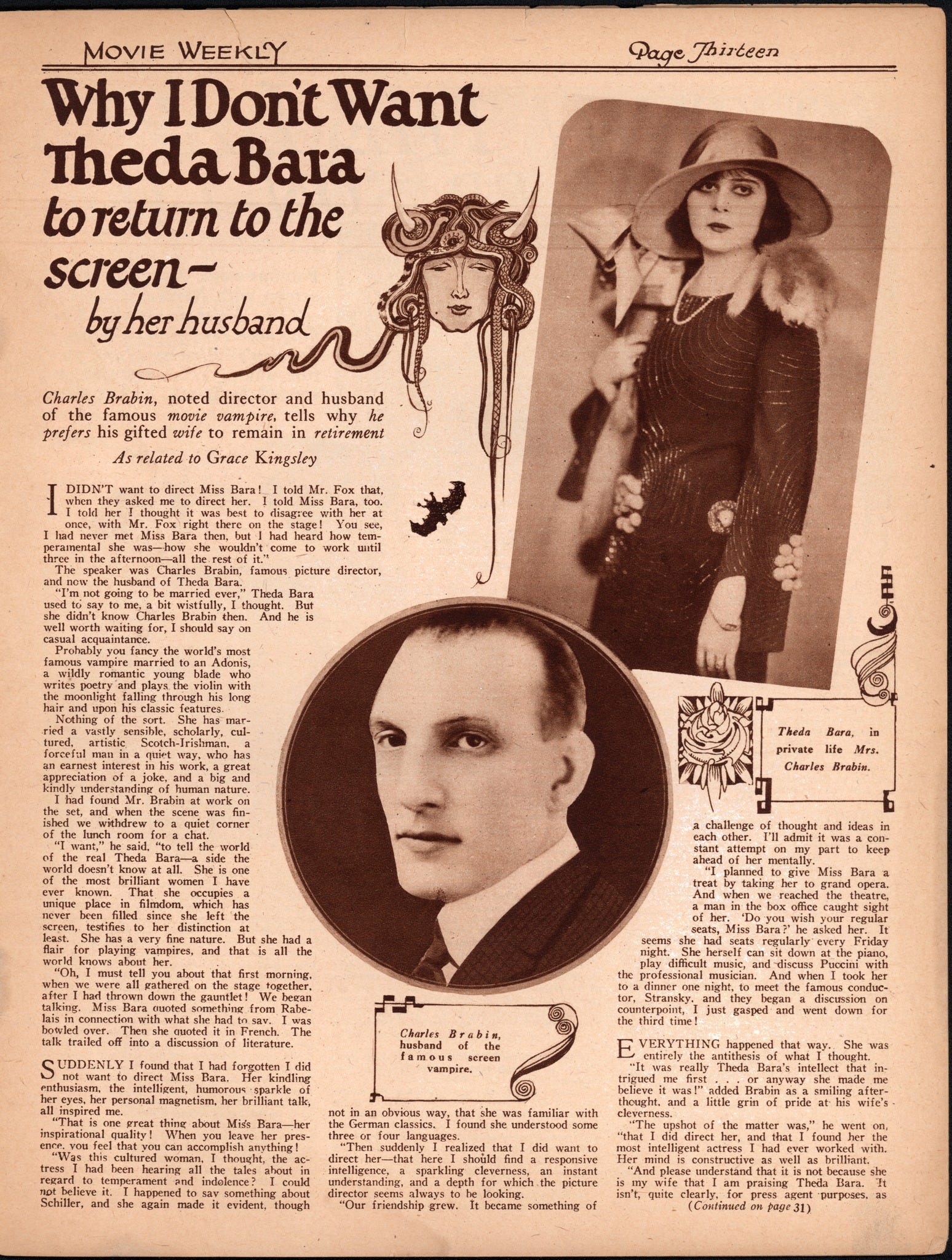The magazine includes an article titled “Why I Don’t Want Bara to Return to the Screen—By Her Husband.” Bara married Charles Brabin, who had directed one of her films. He continued to direct films, but she retired, and spent the rest of her life as a Hollywood socialite, joking about her scandalous legacy. There’s also an article about her post-film career life, and one in which an amateur character expert explores how “Theda Bara’s Face Tells Why She Was a Vampire.” (I’ve included several pages of this article at the end of this post.)