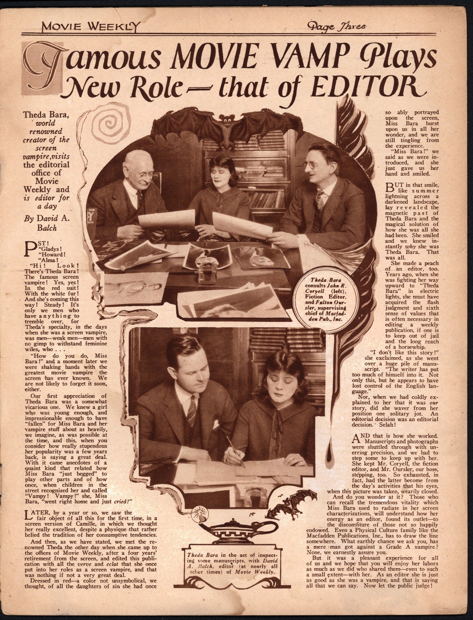 And here are excerpts from the 1923 issue of Movie Weekly guest edited by Bara. (Full issue available here.)